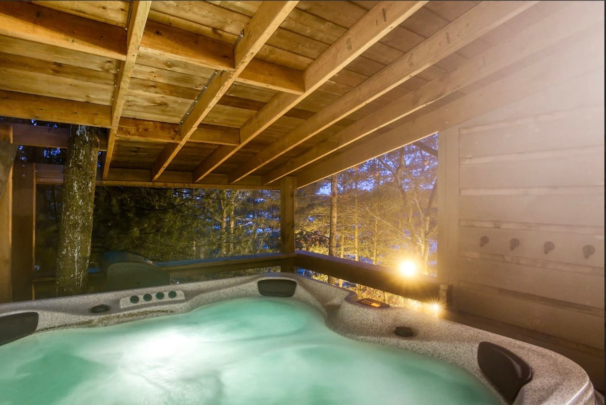 Escape to a serene lakeside retreat this summer. From your private dock, take in the beauty of the vibrant nature wonderland. When evening falls, unwind in the hot tub with stunning views, gather around the fire pit for s’mores and stargazing or cozy up by the fireplace with a warm cozy drink ☕ Book your unforgettable waterfront cottage retreat now! 🏡✨