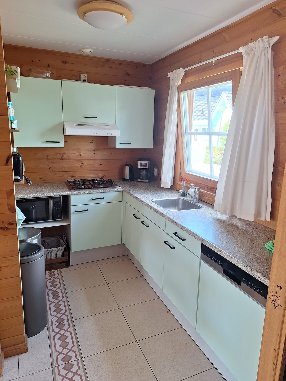 Գեղեցիկ հանգստի տուն՝ մեծ ննջասենյակով և խոհանոցով, որտեղ կա կերակուր պատրաստելու հնարավորություն և օդաքարշ խցիկ։ Բացի այդ, կա սառնարան սառցախցիկով և ջեռոցով/միկրոալիքային վառարանը: Գյուղական ոճով հարմարավետ հյուրասենյակը ունի 2 x 2 անձոց բազմոց և 4 անձի համար նախատեսված ճաշասեղան։ Հյուրասենյակը հագեցած է փայտի վառարանով, որը կարելի է օգտագործել (փայտի պարկերը հասանելի են 6,00 եվրո/հատ): Բնականաբար, տունը հագեցած է ինտերնետով և հեռուստացույցով։ Կա փակվող հեծանիվների պահարան, որը հոսանքի միացման հնարավորություն ունի (էլեկտրական հեծանիվը լիցքավորելու համար)