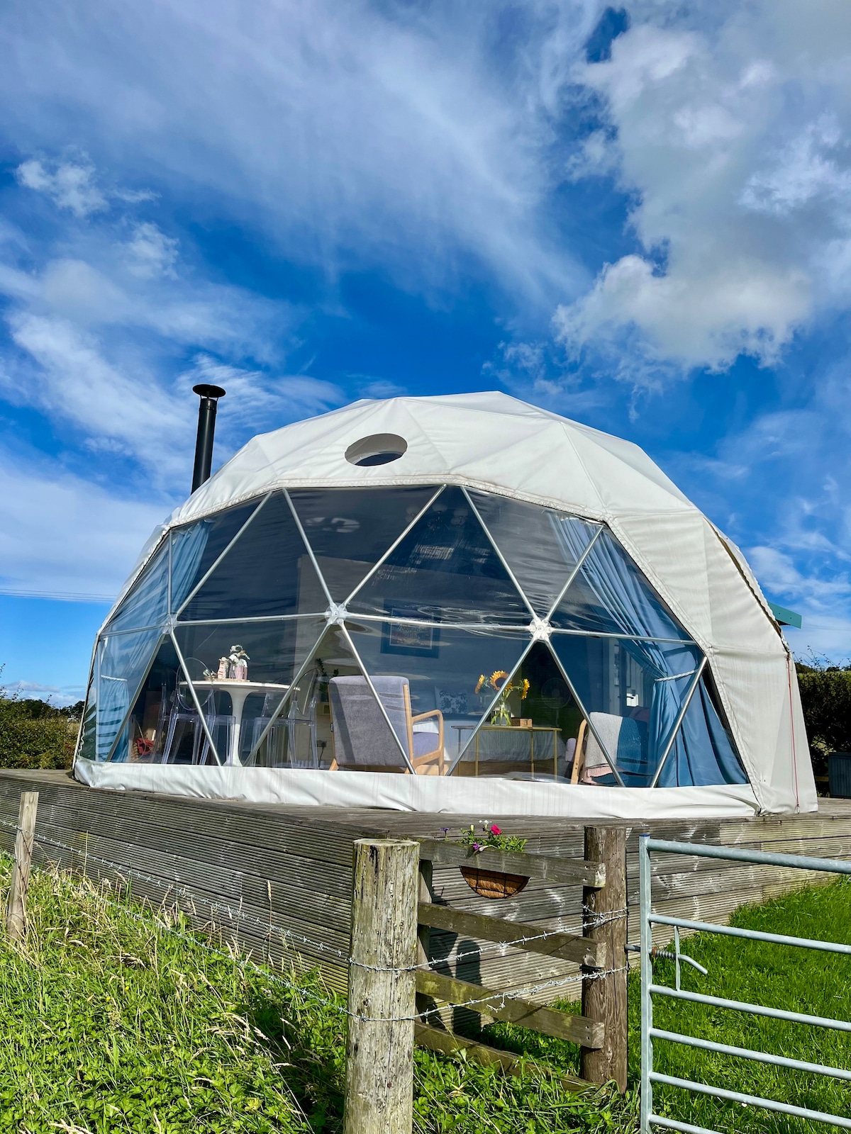 Enjoy our stunning luxury glamping dome with spectacular views over the countryside and Castle Semple Loch. Ideal for a small group of friends or a family, but equally just as perfect as a romantic getaway. Equipped with king-size bed, double bed, an ensuite shower room, high tech composting toilet, mains electricity, Wi-Fi, smart TV, Air fryer, Nespresso Virtuo machine, cooking facilities, wood-burning stove and a lovely garden area with a BBQ, Fire pit, picnic bench and 2x sun lounging chairs.