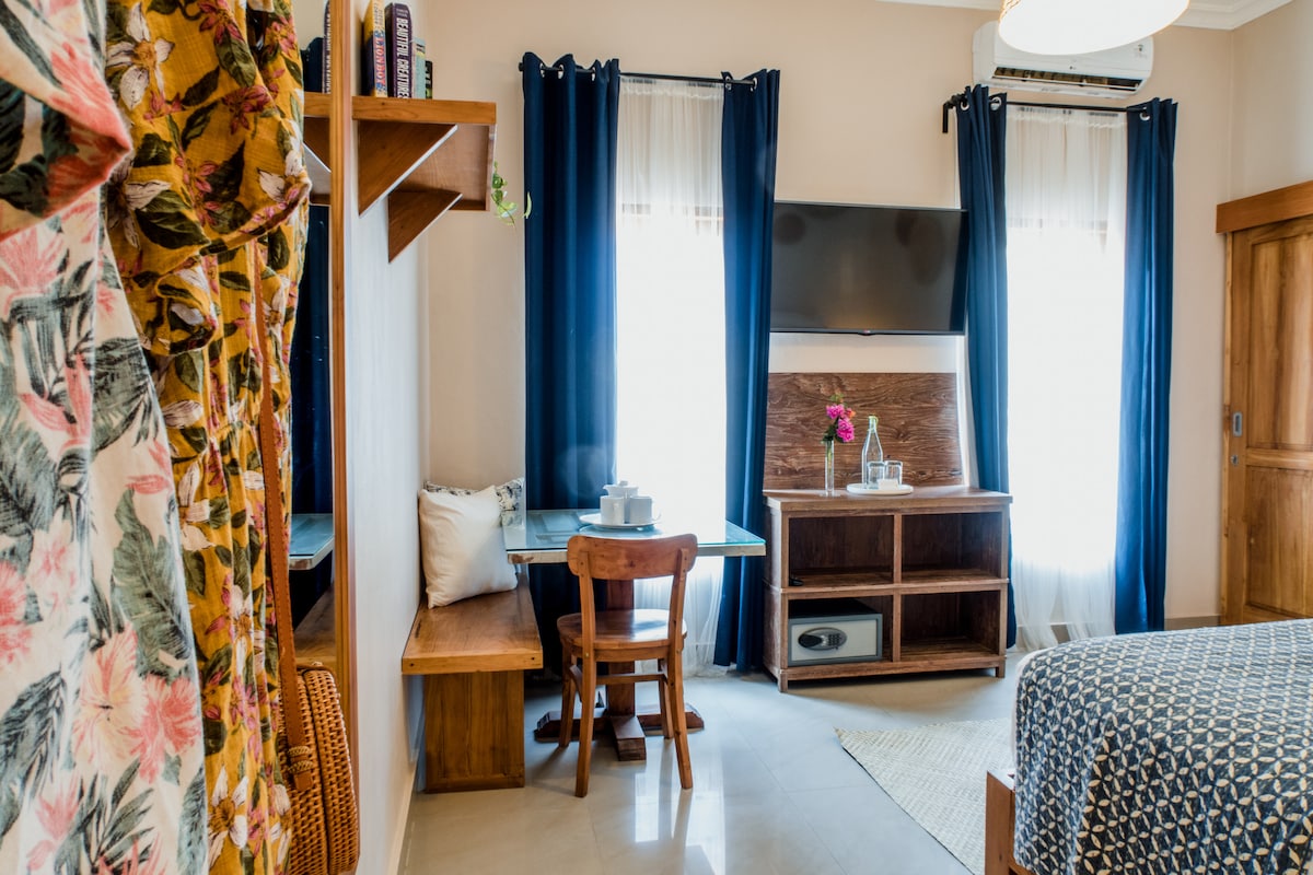 This modern, boho-chic room is thoughtfully decorated with two single beds or one large bed with comfy mattresses, luxurious bedding, and a fresh, hot water shower. The room is located at the front of our resort above our dive shop and is perfect for a group of friends or a solo traveler wanting to enjoy our famous nightlife and explore everything our paradise island has to offer.