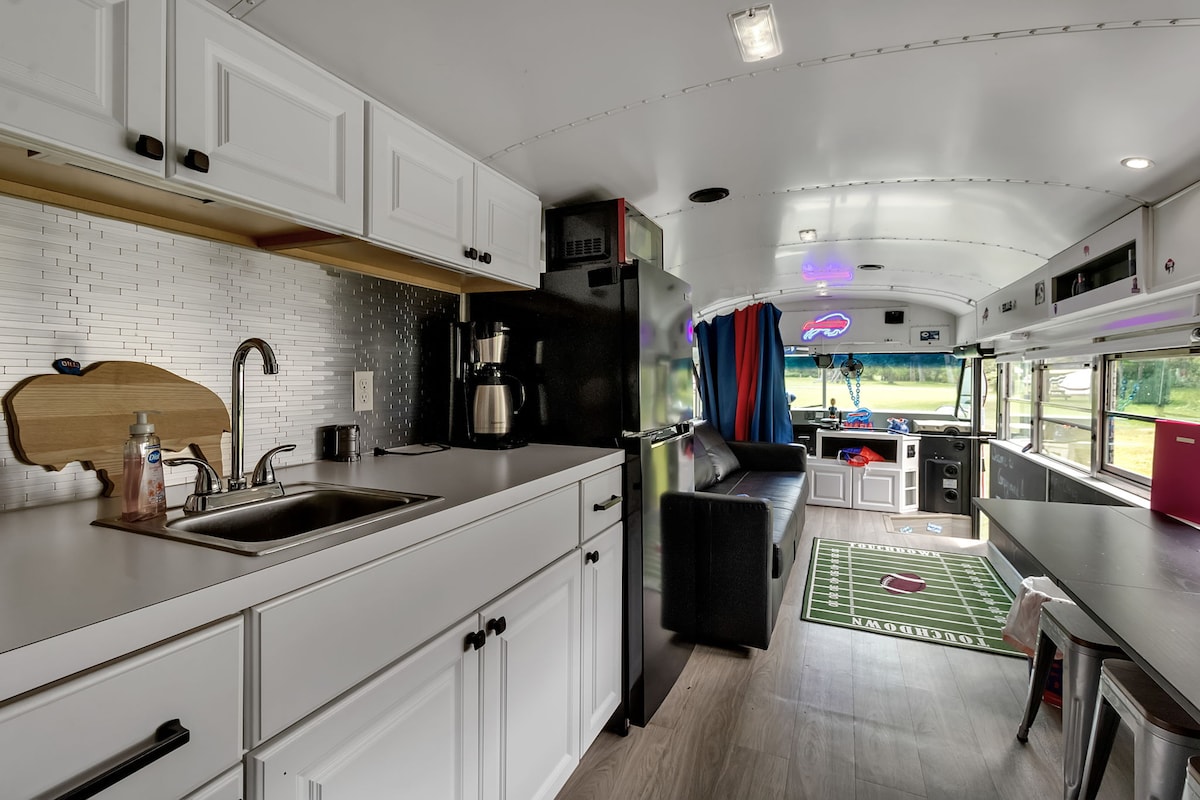 Վայելեք գլեմփինգ վերափոխված դպրոցական ավտոբուսում՝ Նյու Յորք նահանգի Բուֆալո քաղաքի մոտակայքում գտնվող Էլիկոտվիլ քաղաքի մոտ։ Այս յուրահատուկ տունը գտնվում է Իշուա Քրիկի մոտակայքում և ներառում է բացօթյա մասնավոր լոգարան, խարույկատեղ և պատիոյի նստատեղեր։ Ներսում կգտնեք երկտեղանի մահճակալ, քնելու բազմոց, ջեռուցում և օդորակիչ, զուգարանով լոգասենյակ և գործնական խոհանոց։ Հյուրերը կարող են նաև օգտվել մեր բացօթյա խոհանոցից, բաղնիքից, կայակինգից և քեմփինգի հարմարություններից։ Կենդանիներ թույլատրվում են։ Ներսի առաստաղի բարձրությունը 6 ֆուտ է։