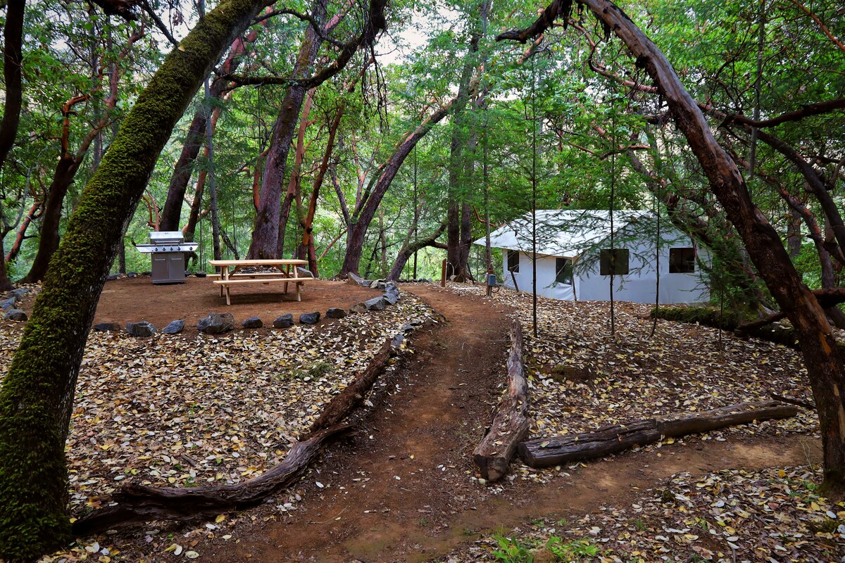 Վայելեք բնության գրկում գտնվող այս ռոմանտիկ վայրի հաճելի միջավայրը ։ Միայն երկու մղոն է Hwy 120 մոտ Groveland CA եւ Pine Mountain Lake հարեւանությամբ. 30 մղոն դեպի Yosemite. Գլեմփինգ վրանը պարսպապատ տարածքում է, այն 270 մետր է, և այն գտնվում է 500 քառ. մետր տախտակամածի վրա,ձեր գետնից դուրս: Ներսում կա թագուհու մահճակալ և վերջնական սեղաններ, շատ հանգիստ և մասնավոր ճամբար ունի թարմ սառը լեռնային ջուր , դա հիանալի ջուր է, կայանատեղի է նաև պարսպապատ տարածքում , ինչպես նաև մասնավոր պորտա աման լվանալու ավազանում ՝ ձեռքերը լվանալու համար:
