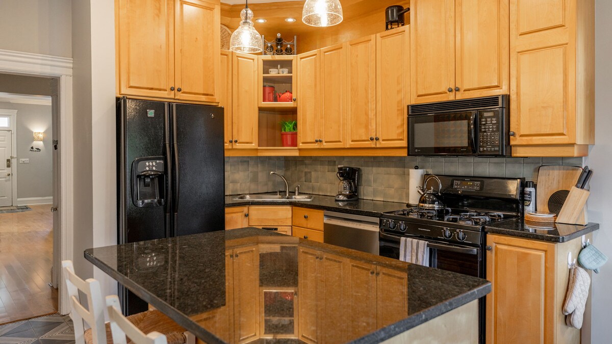 Յուրահատուկ և ժամանակակից տարածք ՝ ընդարձակ կայանատեղով, փայտյա բուխարիով, մեծ մասնավոր պատշգամբով ։ Քայլեր հեռու բոլոր տեսարժան վայրերից/տեսարժան վայրերից և մանրածախ առևտրից ։ Այն հարմարավետ է, լավ պահպանված և մաքուր: Հարավային երեսապատման պատուհաններն առաջարկում են շատ բնական լույս: Ննջասենյակներն ընդարձակ են և ունեն առանձնասենյակներ և պահարաններ: Բարձր վերջնական tempurpedic ներքնակներ եւ Sealy sofabed. Խոհանոցը և լոգասենյակները համալրված են բոլոր հիմնական պարագաներով ՝ ձեր այցը կազմակերպելու համար ։