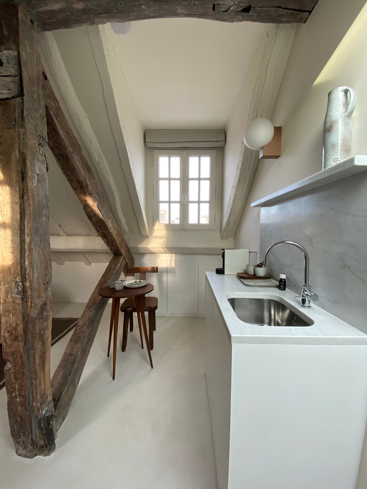 Սենտ Լուիս կղզու սրտում գտնվող մեր ստուդիան մոտ 30 մ2 կահավորված է Փարիզի ամենագեղեցիկ հուշարձանների հիասքանչ տեսարանով: 2019 թվականին ամբողջովին վերանորոգված բնակարանը հանգստի և հանգստի գոտի է ՝ բարձրակարգ անկողնային պարագաներով և գեղեցիկ նյութերով: Այն գտնվում է վերին հարկում (5 - րդ հարկ) առանց վերելակի, 17 - րդ դարի շենքում: Տարածքը հարմար է մեկ կամ երկու հոգու համար ։