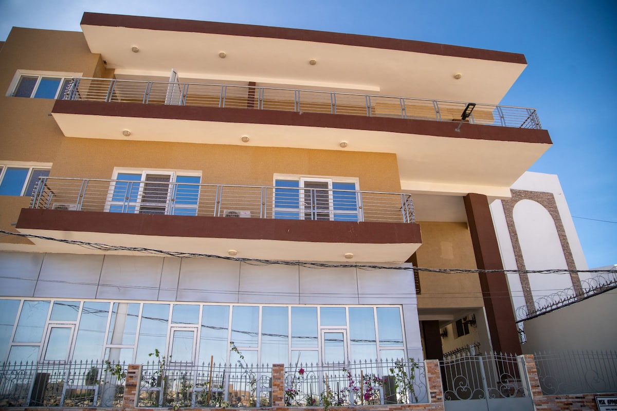 Détendez-vous dans ce logement calme et élégant. situé proche de l'ambassade des Etats-Unis à Nouakchott dans une zone de sécurité. L'immeuble neuf avec un service impeccable. Salle de gym, salle de conférence, Piscine une espace détente, parking intérieur et extérieur.
