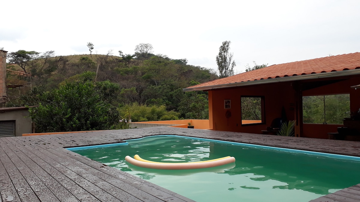 Հարմարավետ տուն լեռներում, BH Shopping - ից 20 րոպե հեռավորության վրա, պահպանված անտառի և գեղեցիկ տեսարանի պայմաններում: «Հեռու և ամեն ինչին մոտ », քանի որ մենք գտնվում ենք լեռներում և մոտ ենք սուպերմարկետներին, հացաբուլկեղենի խանութին, դեղատանը, բնակելի համատիրություններին: Կան 3 en - Suites, երկու երկտեղանի , ամերիկյան խոհանոց, mezzanine, բուխարի, տախտակամած հետ ռիթմ զուտ. Լողավազան, վեյր, ինչպես նաև շատ բնություն, մաքուր օդ, գեղեցիկ եղանակ և լռություն: Խնամակալն ապրում է տեղում ։