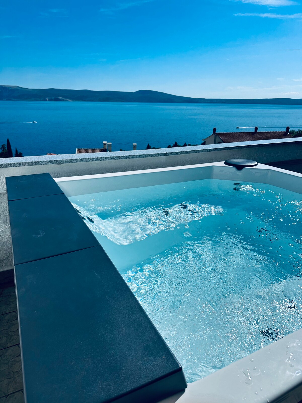 ՆՈՐՈՒՅԹ 2025 թվականի սեզոնի համար!!! Մասնավոր հիդրոմերսման մինի - լողավազան ջակուզի և չոր (ֆիննական) սաունա ՝ հոյակապ տանիքի ծովային տեսարանով տեռասում ։ Քրոմոթերապիայի համակարգ և ՛ մինիպուլում, և ՛ սաունայում ։ Վայելեք արևայրուքն ու մայրամուտները բացօթյա սպա փորձառություն ՝ հիանալի ծովային տեսարանով Ադրիատիկ ծովում և Կրկ կղզում: Կատարյալ է 6 -7 հոգու համար ։ Առկա է 3 ննջասենյակ, որոնցից յուրաքանչյուրում կա երկտեղանի մահճակալ + 1 մեկտեղանի մահճակալ Օդորակիչով ։ Այգում առկա մանղալ, գերարագ Wi - Fi, կայանատեղի ։
