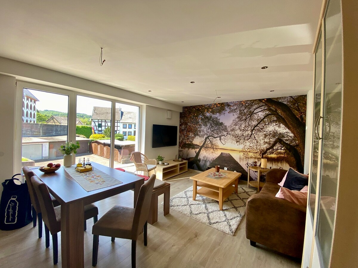 Ընկերական հանգստյան բնակարան ՝ առավելագույնը 5 հոգու համար նախատեսված 90 քմ մակերեսով փակ տարածքում ընդարձակ բնակելի տարածք Ամբողջական խոհանոց Ննջասենյակ, 1.40 մահճակալ + 2 բազմոց մահճակալ (Լոգարան) Լոգասենյակ Հատուկ առաջարկ և հանգստություն տեղաշարժվելու և հանգստանալու և լիցքաթափվելու համար մոտ Nürburgring 6 կմ, Պրեմիում արշավային արահետներ անմիջապես դռնից դուրս Booser Doppelmaar & Eiffel Tower ներտնային սաունա ՝ ներառյալ լողավազանը ՝ ըստ պայմանավորվածության Մոտակա գնումներ 8 կմ Հացաբուլկեղենի խանութ ՝ ոտքով հեռավորության վրա Ռեստորան կարճ ոտքով