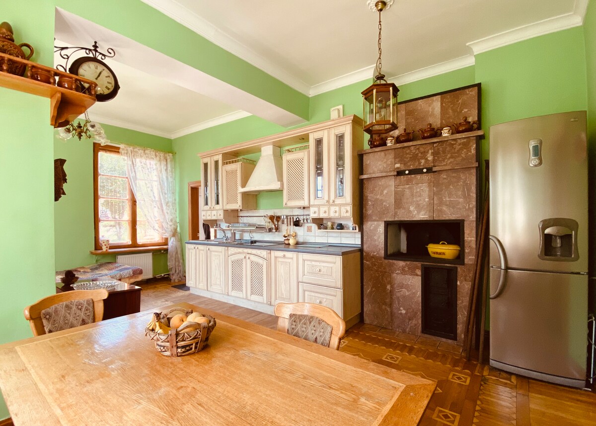 A 4 bedroom house with a lake on the lot, just outside of the city, your private driver and car (included). The house is 200 sq m, fully equipped, 4 bedrooms, sleeps 8, a living room, large kitchen, a terrace, 2 full bathrooms (both have a tub and a shower cabin), walk-in wardrobes, a huge lot with a lake. We will provide you with A ENGLISH-SPEAKING DRIVER AND A CAR for the duration of your stay, day and night, including airport pickup and drop off.