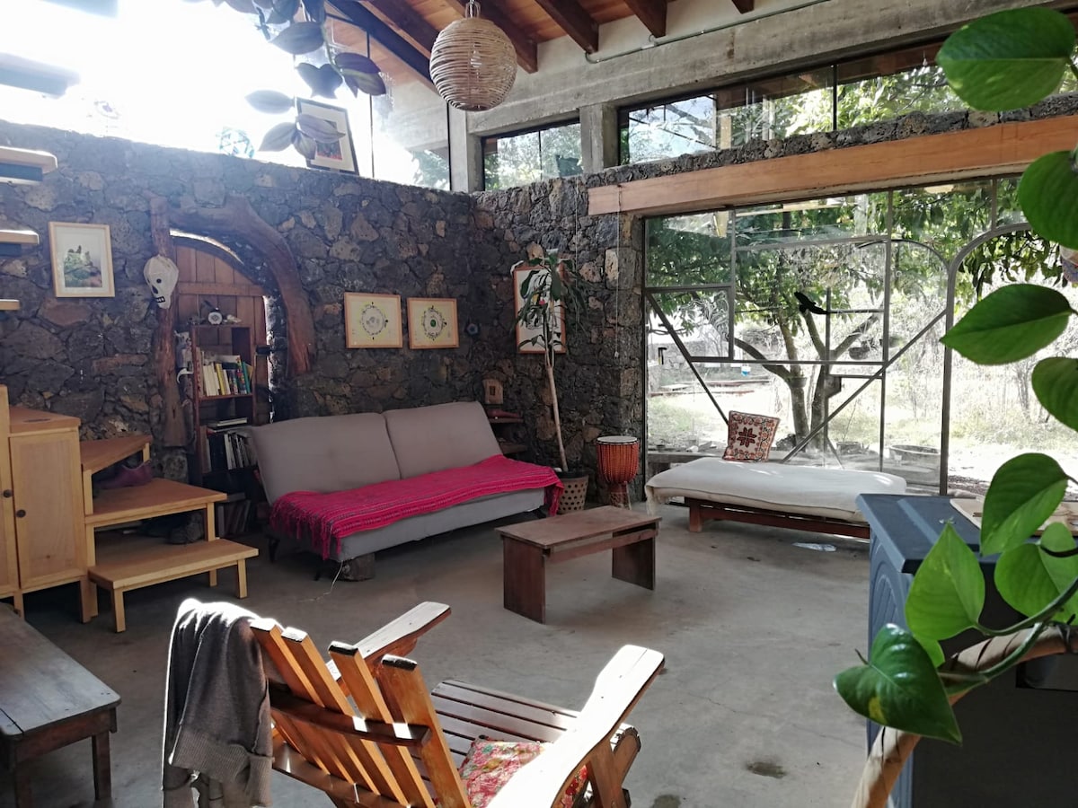 Երկիրը տուն հանգիստ տարածքում Malinalco. 1,350 M2: Ապակիներով շրջապատված հյուրասենյակ ՝ բոլոր ուղղություններով այգիների տեսարանով: Մեծ խոհանոց կենտրոնում և մեծ վերանդաներ ։ Երկու ննջասենյակ ՝ զուգարանով լոգասենյակով ։ Այցելուների լոգասենյակներ: Երկու ննջասենյակ «Հոբիթ Հաուս »- ում ՝ գեղեցիկ դիզայնով: Երկու հեռուստացույց և պրոյեկտոր ՝ արբանյակային հեռուստատեսությամբ և հոսքային եղանակով ։ WiFi : Խաղասենյակ, ճոճաթոռ, ցանցաճոճեր, ստուդիա և դիտակետեր: Մի մեծ սալորի ծառ և այլ ծառեր: Բույսեր և ծաղիկներ: 4 մեքենայի կայանատեղի: