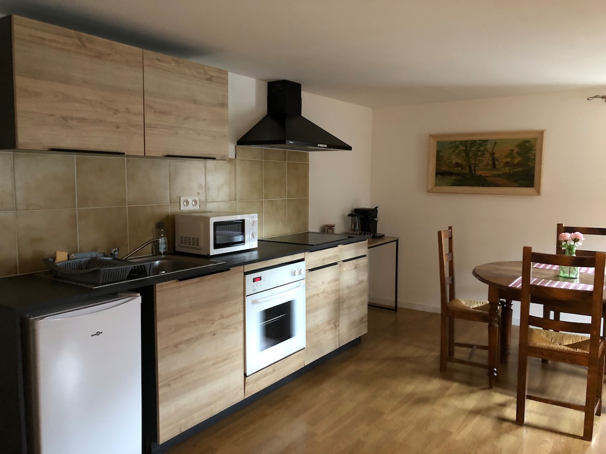 Spacieux appartement situé au rez-de-chaussée de notre maison. Idéal pour 4 à 5 voyageurs. 1 chambre cosy avec un lit double (140x190) et un lit d'appoint (80x 190) 1 grand espace séjour avec un coin "nuit" et son lit double (140 x 190), un espace de vie avec canapé, TV, de nombreux jeux. 1 cuisine équipée : senseo, grille pain, four, lave vaisselle.. 1 sdb avec douche . Au calme, jardin à l'arrière de la maison : table, transats. Parking privé, terrasse avec salon de jardin.