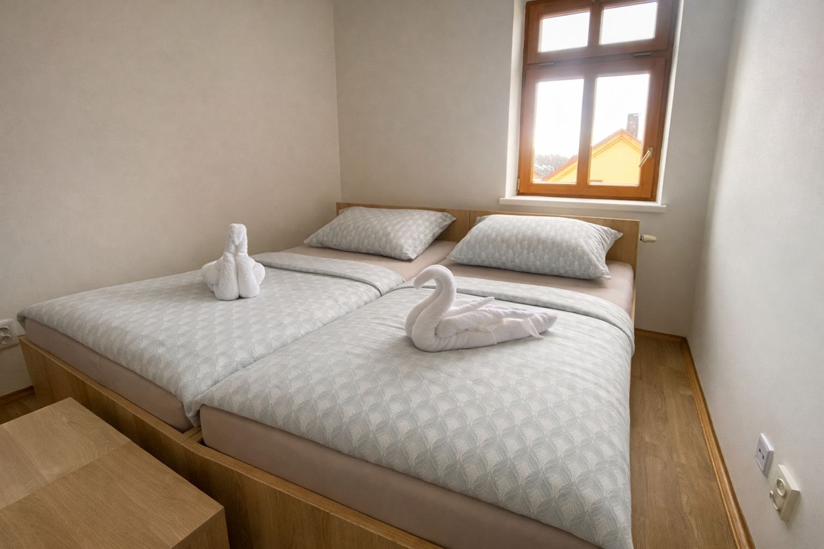 Մեր բնակարանում մնալու ընթացքում դուք կվայելեք խաղաղություն և հանգիստ ։ Այն գտնվում է սեփականատերերի ընտանեկան տան հարևանությամբ գտնվող սեփականությունում ։ Բնակարանն ունի առանձին մուտք: Պատուհանից բացվում է անտառի կամ պարտեզի տեսարանը ։ Վարորդական կամ հեծանվային հեռավորության վրա լողալու համար կան մի քանի քարհանքեր կամ լճեր ։ Քայլարշավի համար նախատեսված գեղեցիկ վայրերի մոտակայքում ։ Ձմռանը կարելի է ուղևորվել դեպի մոտակա լեռնադահուկային լանջեր կամ լեռնադահուկային արահետներ (մեքենայով ՝ մոտ 30 րոպե )։ Մոտակայքում են Rychlebské արահետները, որոնք շատ գրավիչ են հեծանվորդների համար ։