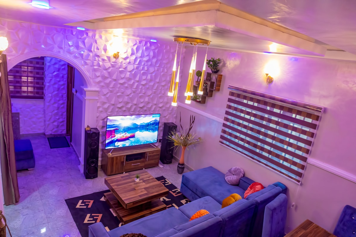 All Day uninterrupted power supply fully serviced round the clock house keeping fitted and functional kitchen smart tv free WiFi free and secure parking armed security guard government reserved area only 2 mins from all amenities including shopping cinema bar and lounges.
