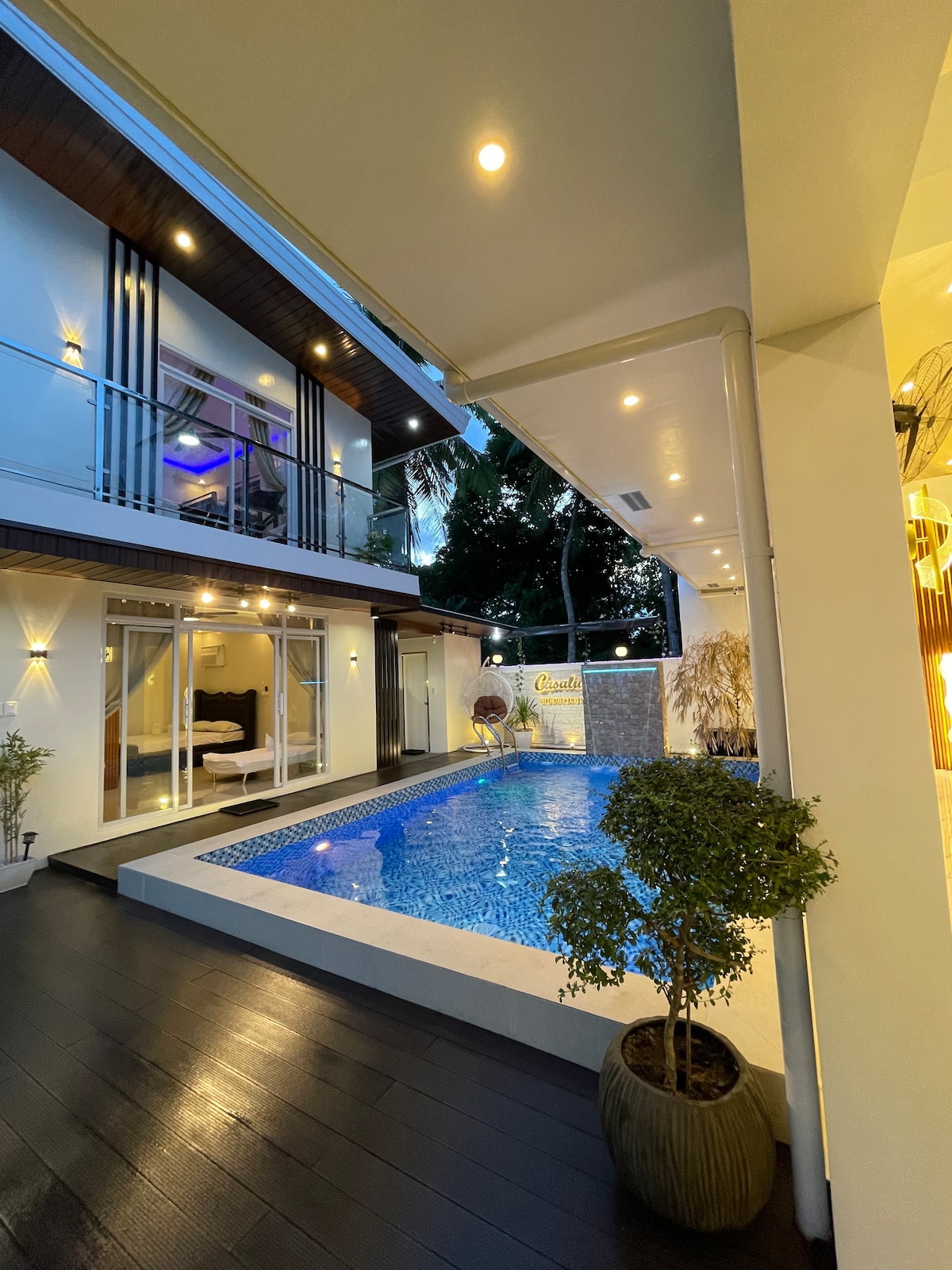 AMENITIES: *exclusive use of the entire House *free wifi access *grilling area *family pool *many parking space *water dispenser *Refrigerator w/ "Knock Twice,See Inside" Technology *microwave *oven toaster *kitchen utensils (plates, spoons, glass and other cook wares) *daily changed Bed sheets and pillows *card games/board games *Videoke *4Bedrooms (1 masters BR with own cr, 2 queen sized BR, 1 room with double queen size BR) *3Bathrooms *Garden Terrace *76 inches TV