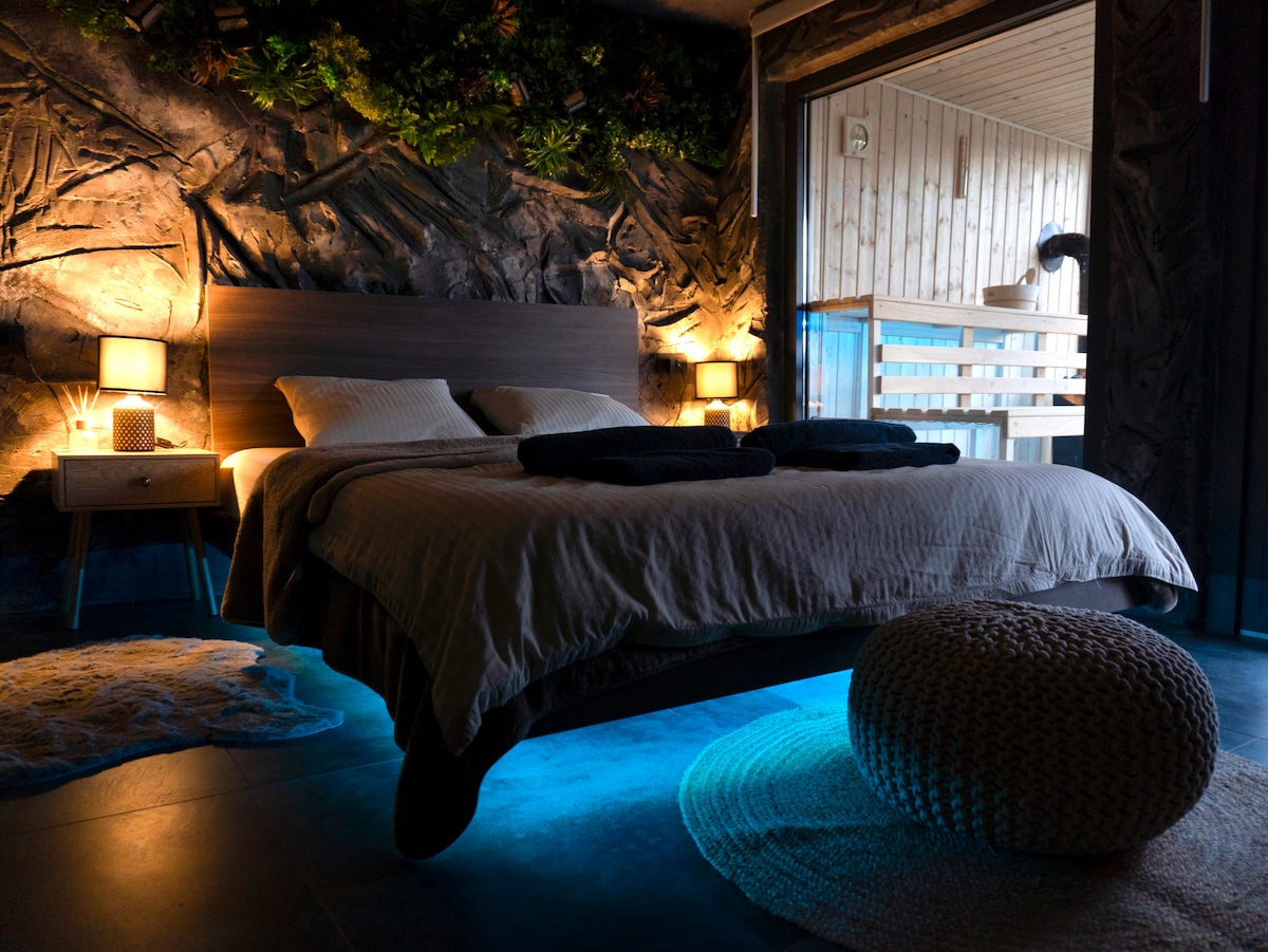 Kuća smještena usred šume, luksuzna kupaonica u stilu špilje, lebdeći krevet, sauna i jacuzzi među drvećem.