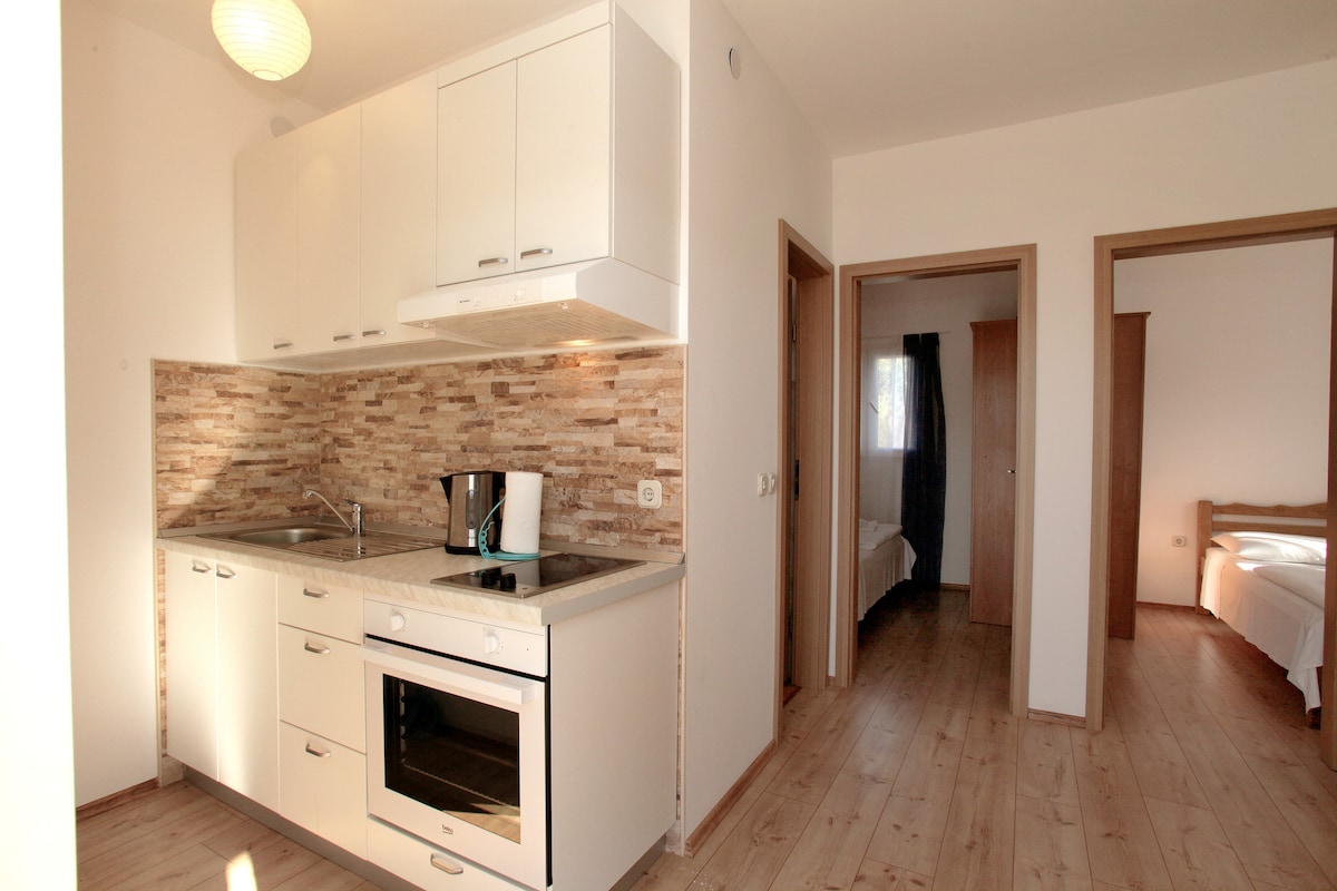 The two house apartments with 2 bedrooms in each, 8 persons, 3 kitchens, 2 living rooms, 2 bathrooms, 3 terraces, swimming pool, 2 barbecues, volleyball and football field. Peaceful area, just 18 km away of UNESCO's city of Trogir.