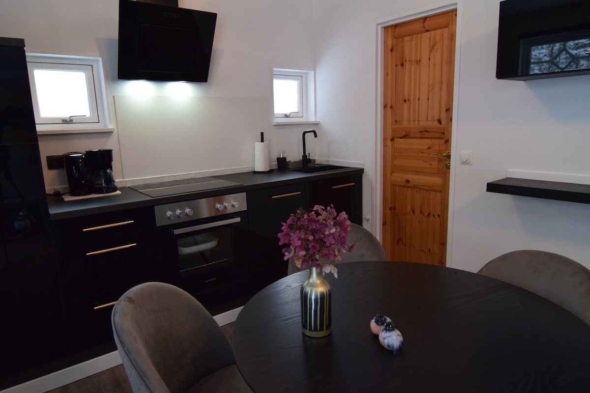 Our studio, built in 2016 is situated close to the city but still in the countryside. There are three beds - one single bed at the loft and a sofa bed (queen size) in the combined kitchen and living room. If there are requests, we can also arrange space for a fourth person on a mattress at the loft. Large bathroom with sauna. 28 sqm with bathroom and loft. Pool and garden are shared with the host family. A newly built outdoor gym is 100 meters from the studio.