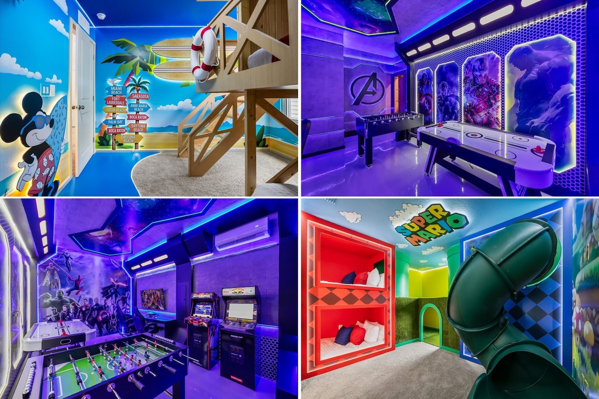 Օռլանդո, Դիսնեյ, Արկադային, Կինոթատրոն, Մերսման աթոռ, լողավազան, ջակուզի, 2 թագավորական մահճակալ, մանկական երկհարկանի մահճակալ, Kissimmee: Արդիականացված խաղասենյակ առանձին տանը, թատրոն երեկոների համար, տուն և ձեր առանձին լանայը լողավազանով և ջակուզիով: Ընտրեք Pump It Up պարը, Սպունգ Bob Racing, NASCAR Racing, Legends 3, Pac - Man - ի Արկադային կուսակցություն, 80 դյույմանոց հեռուստացույց եւ Xbox 360: Դիտեք ձեր սիրած ֆիլմերը 92 - դյույմանոց պրոյեկցիայի էկրանին, շրջապատի ձայնին և մարզադաշտի ոճի նստատեղերին: