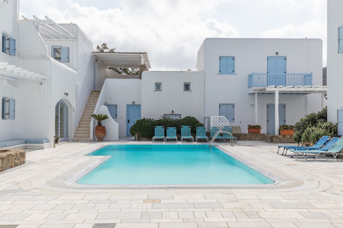 Traditional Mykonian style apt in a peaceful, luxurious complex, ideal for couples and families. Located in Ornos,3' walk from Korfos Beach (kitesurfer's beach) & 5' walk from Ornos Beach. There is a large, shared swimming-pool, a fully equipped kitchen, bathroom, open-plan bedroom& living room (2 big sofas – 3 people sleeping). There is a front veranda with a wooden pergola that offers unique relaxation viewing the pool and high speed of 50 Mbps Wi-Fi.