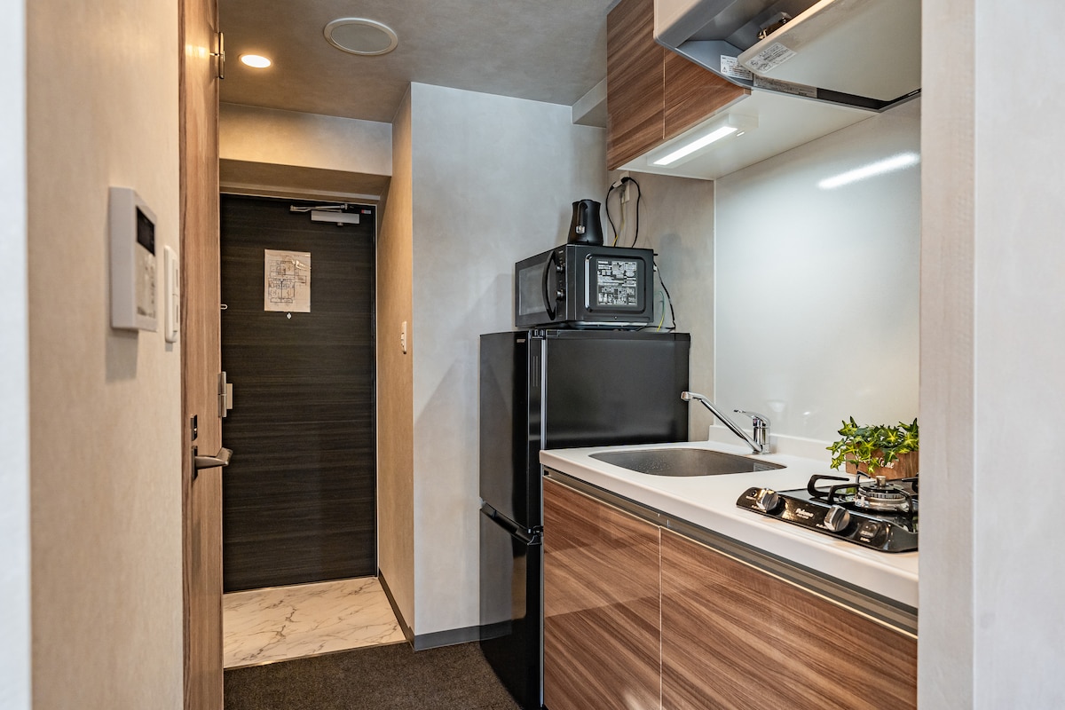 Just one stop from the city’s rush, yet quietly removed from its noise — Reikyo presents a quiet room designed for travelers who value calm, light, and refined minimalism. This king-bedded space blends traditional Japanese elements with modern comfort, featuring soft shadows cast through shoji screens and a curated palette of deep wood, stone grey, and warm indirect lighting. Enjoy a cup of tea in the soft morning light, cook a simple meal in the built-in kitchen, or simply unwind in silence.