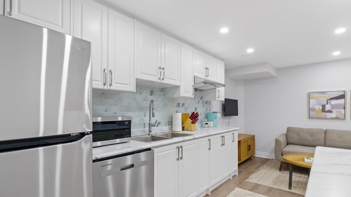 Legal Basement - This chic place comfortably accommodates up to 5 guests and comes fully furnished. There are 2 bedrooms, each accommodating 2 guests, along with a daybed in the living room for the 5th person. One bedroom offers a queen-size bed, while the other has a double-size bed. Also, there are 2 study tables with chairs, one in each bedroom and one in the living room. The meticulously designed kitchen boasts modern and luxurious touches. The stylish washroom features a standing shower.