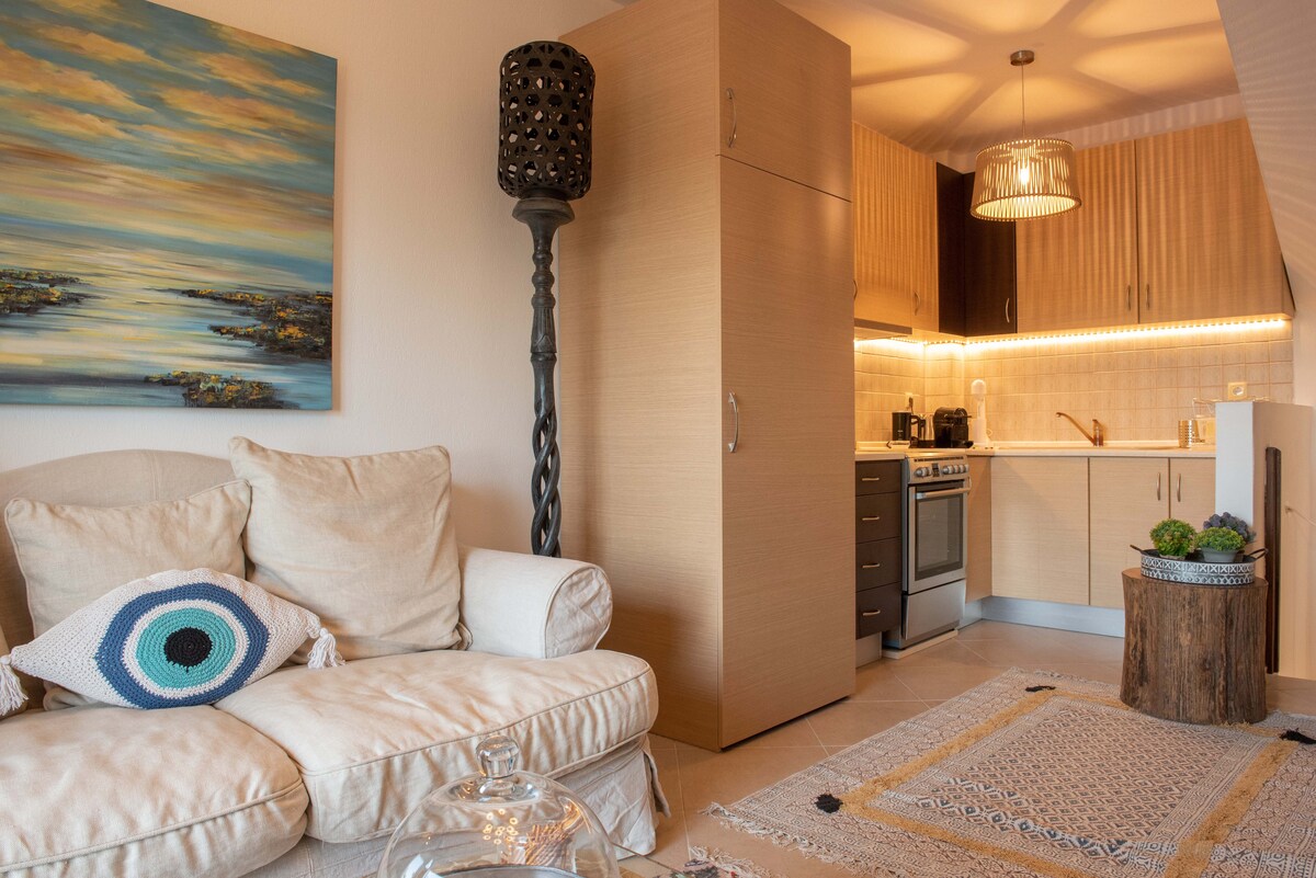 Cozy apartment in Pefkochori center, 300m from the beach. Walking distance from anything you might need (Bus stop, super market, coffee, restaurant, car/bike rental, bar etc) In the apartment you will find a coffee maker, water boiler, toaster, silverware, dishes, cooking utensils, blow dryer and wi-fi Sheets, towels and all other utensils, are sterilized and cleaned as per the ministry of health instructions, to keep everyone safe from COVID-19.