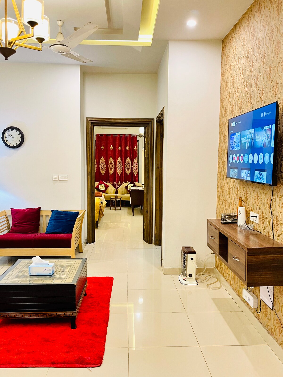 Welcome to The Royal Residence—A Stylish and modern living experience, located in Bahria Town, Rawalpindi, this stylish apartment features a subtle living area, a kitchenette, and a comfortable queen-sized bed for a relaxing stay. Living Perks ⦿24/7 heating & cooling (inverter) ⦿Free Snacks ⦿Balcony Location Perks ⦿1 minute walk to KFC, McDonald’s, Subway, Pizza Hut and all famous food chains. ⦿Secure building with 24/7 security *Only for friends and families* *Unmarried Couple Not Allowed*