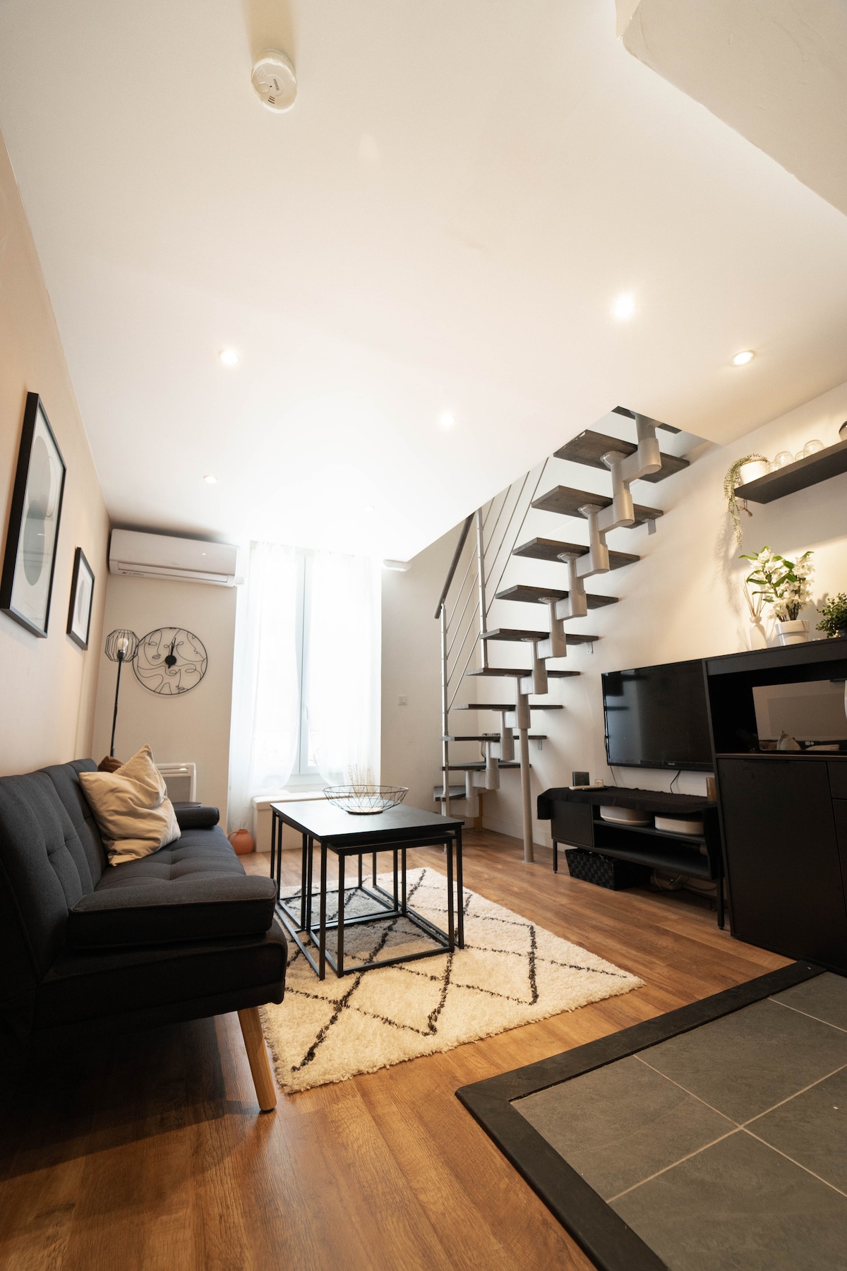Lovely loft in town center. Located on the ground floor, very quiet, 5 minutes from the station and 10 minutes from Avenue Jean Médecin on foot. Suitable for 2 people or a couple with 1 child (sofa bed for 1 person). High ceilings, exposed beams, old bricks and cement tiles. Recently renovated. Facilities include a fully-equipped kitchen with dishwasher and coffee machine, plus a washer-dryer in a dressing area. Chic and contemporary!