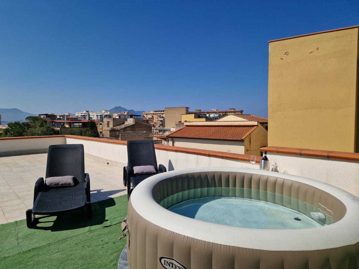 Mondello Pool & Suite is a vacation home in a villa with a large garden. 3 min driving (8 minutes walk) from the beach, 20 min from the airport and 15 min from the city center, it's the perfect place to spend your summer holidays and visit Palermo. The house consists of bedroom, bathroom and kitchen, living room with sofa bed and the common outdoor areas consist of garden, swimming pool, gym and solarium, outdoor shower, kitchenette and outdoor dining area.