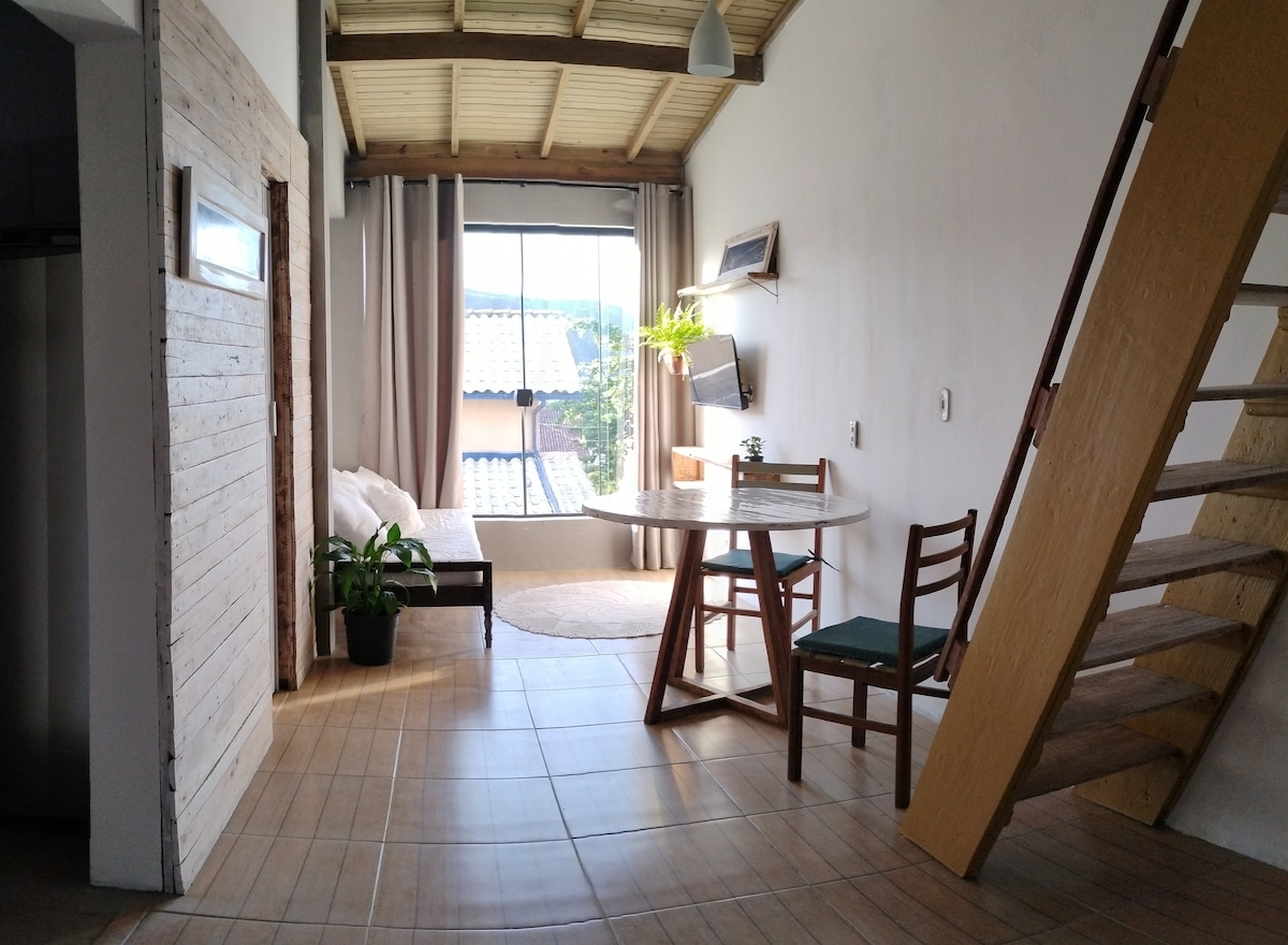 Nosso loft possui quarto e cozinha em um mesmo ambiente aconchegante, banheiro privativo, varanda e uma deliciosa rede para relaxar. Está a 100 metros da praia Guarda do Embaú e a 300 metros do centro. Nosso local é silencioso e de fácil acesso por ruas de calçamento.