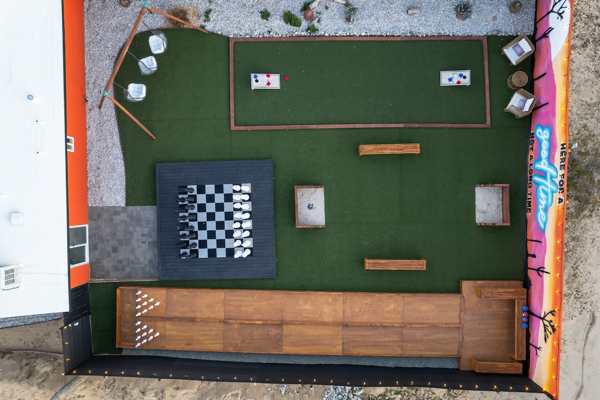 The Drive In - ը մասնավոր անապատային բարդույթ է, որը լի է հարմարություններով, որպեսզի ձեր խումբը ունենա ձեր երազանքների Joshua Tree - ի փորձը: Մենք ստանում ենք դա ։ Դուք գալիս եք Ջոշուա Թրի ՝ բնության հետ կապվելու համար, այնպես որ մենք մանրակրկիտ կերպով ստեղծել ենք բացօթյա միջոցառումներով սեփականություն, որը դուք չեք գտնի որևէ այլ տեղ ։ Ընդգծված է մեր Drive In կինոթատրոնի, բացօթյա լոգարանի, բեռնարկղի լողավազանի, Pickleball Court - ի, Golf Driving Range - ի և Bocce Court - ի կողմից. բոլորը ՝ ազգային պարկի անխոչընդոտ տեսարաններով ։