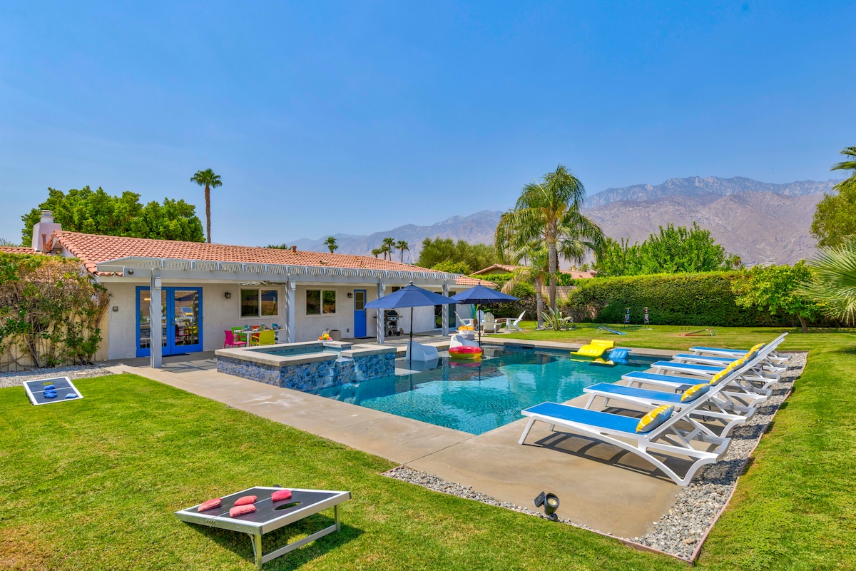 STR #003734 Welcome to this stunning four bedroom home located minutes from downtown Palm Springs! A true playground under the sun. This home boasts 2200 sq feet of living space on a 3/4 acre lot! The house is fully furnished with the finest accommodations!The backyard has a pool, beach sand volleyball pit, pickle ball court, basketball court, four hole putting green, bocce ball and a horseshoe pit. Truly a paradise for any sports fan! Come join us at this AMAZING property!