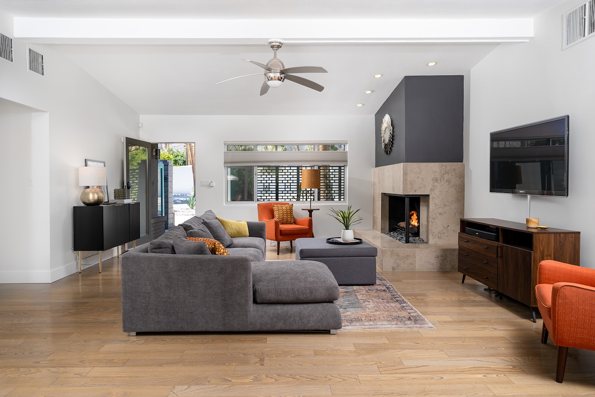 At this bright breezy getaway in the heart of the famous Movie Colony neighborhood, Palm Springs vibes are all around and less than 1 mile from the downtown center. Dip in the saltwater pool and rinse off al fresco before settling in by the fireplace under the palms. Inside, bold colors and rich textures bring warmth to every room, while a comfortable open layout make this a comfortable spot for groups of all sizes. Just a short walk to downtown shops, restaurants, and the Convention Center.
