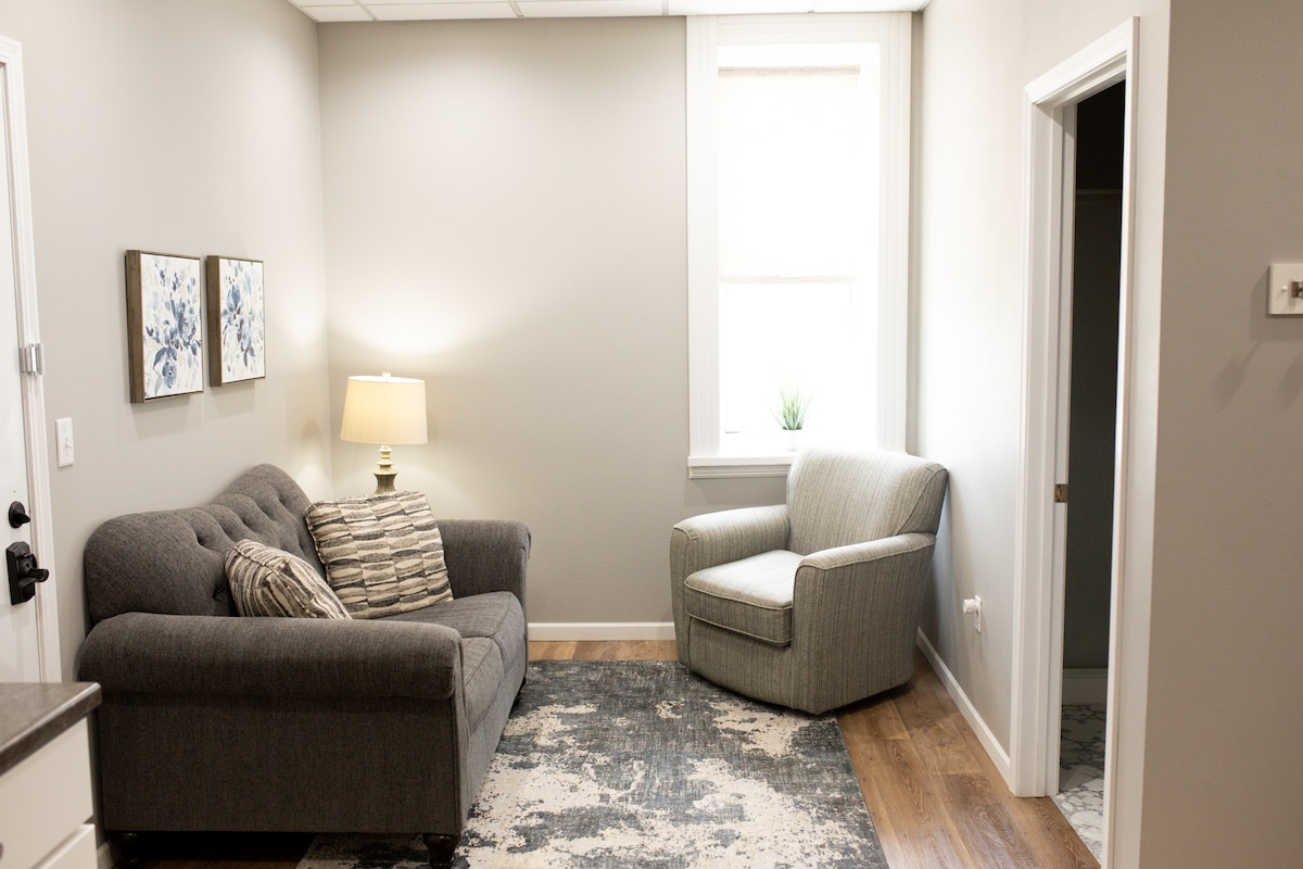 A cozy suite perfect for a small town getaway. This suite includes 1bedroom, living room, bathroom, and kitchen. Just a note, we do not have a TV but do offer free WIFI. **There are quite a few stairs going up to the apartment.