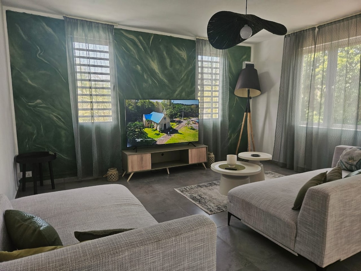 Bienvenue dans votre "Penthouse" tropical à l'étage de la Villa Ti Coco ! Profitez de volumes immenses et d'équipements rares : Espace Spa : SDB exceptionnelle avec baignoire Balnéo & douche. Confort absolu : Cuisine moderne toute équipée avec Lave-vaisselle + Salon XXL lumineux. Repos : 2 chambres climatisées élégantes (Lits Queen). Idéal : Quartier calme à 8 min à pied de la plage. Terrasse privée ventilée. Le spot parfait pour décompresser !