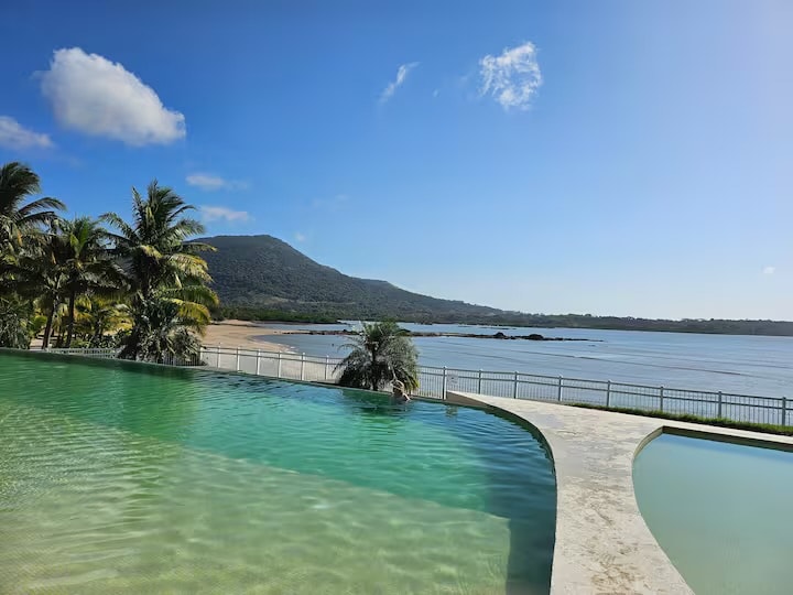 Cozy beachfront apartment. Just 5 meters from the beach and 5 minutes from Panama Pacifico International Airport. Enjoy the ocean breeze, ocean views, and the peaceful surroundings. Fully equipped kitchen, refrigerator, microwave, A/C, TV in the living room and bedroom, full bathroom, and parking included. Includes a 25% discount on meals at Vista Venao Restaurant. Ideal for relaxing, enjoying the sea, or working with a view of the Pacific Ocean.