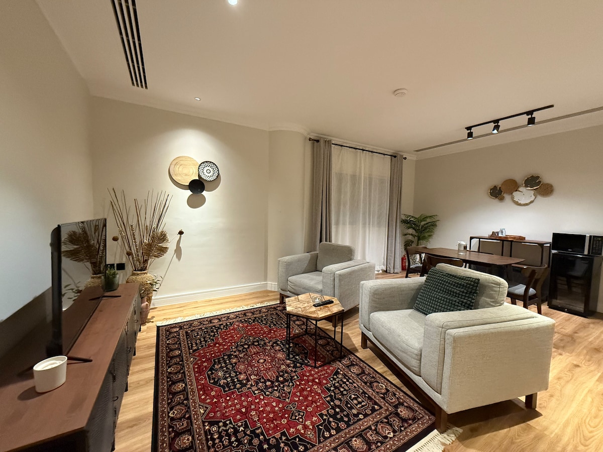 Վայելեք ժամանակակից 2 սենյականոց բնակարան, որը նախատեսված է հարմարավետության և մեկուսիության համար։ Հատվածն ունի մասնավոր կողային մուտք, հատուկ մասնավոր կայանատեղի, նորաձև կահույք, գերարագ Wi-Fi և լիովին կահավորված խոհանոց։ Գտնվում է Էր-Ռիյադի գլխավոր թաղամասում, որտեղից հեշտ է հասնել գլխավոր ճանապարհներին, գործարար թաղամասերին, ռեստորաններին և քաղաքի հիմնական տեսարժան վայրերին։
