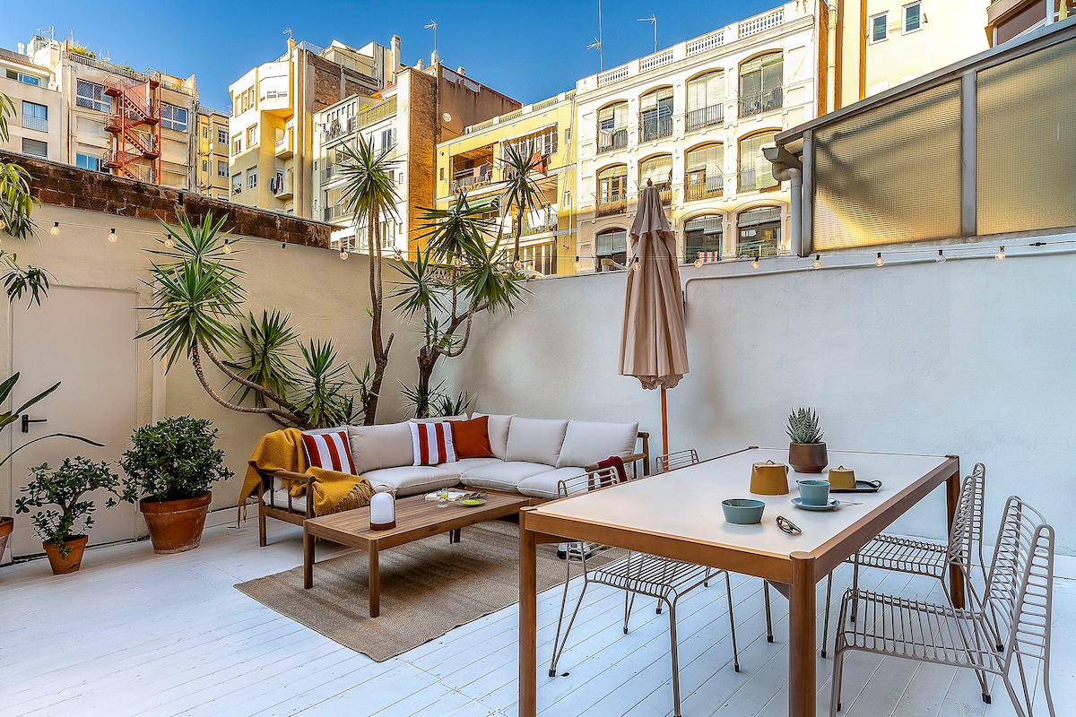 This gorgeous 90m2, bohemian duplex ONE BED apartment has amazing views over the entire city from the large plant -covered terrace. Walking distance from Las Ramblas. There is a bedroom with Queen sized bed downstairs beside a long balcony and another open-plan living area upstairs beside the terrace. There's a smart Tv, free wifi and washing machine and dryer. (please note: it's on the 6th floor and there's NO elevator).Tourist tax (€6.25 per person/per night) IS INCLUDED in the nightly price.