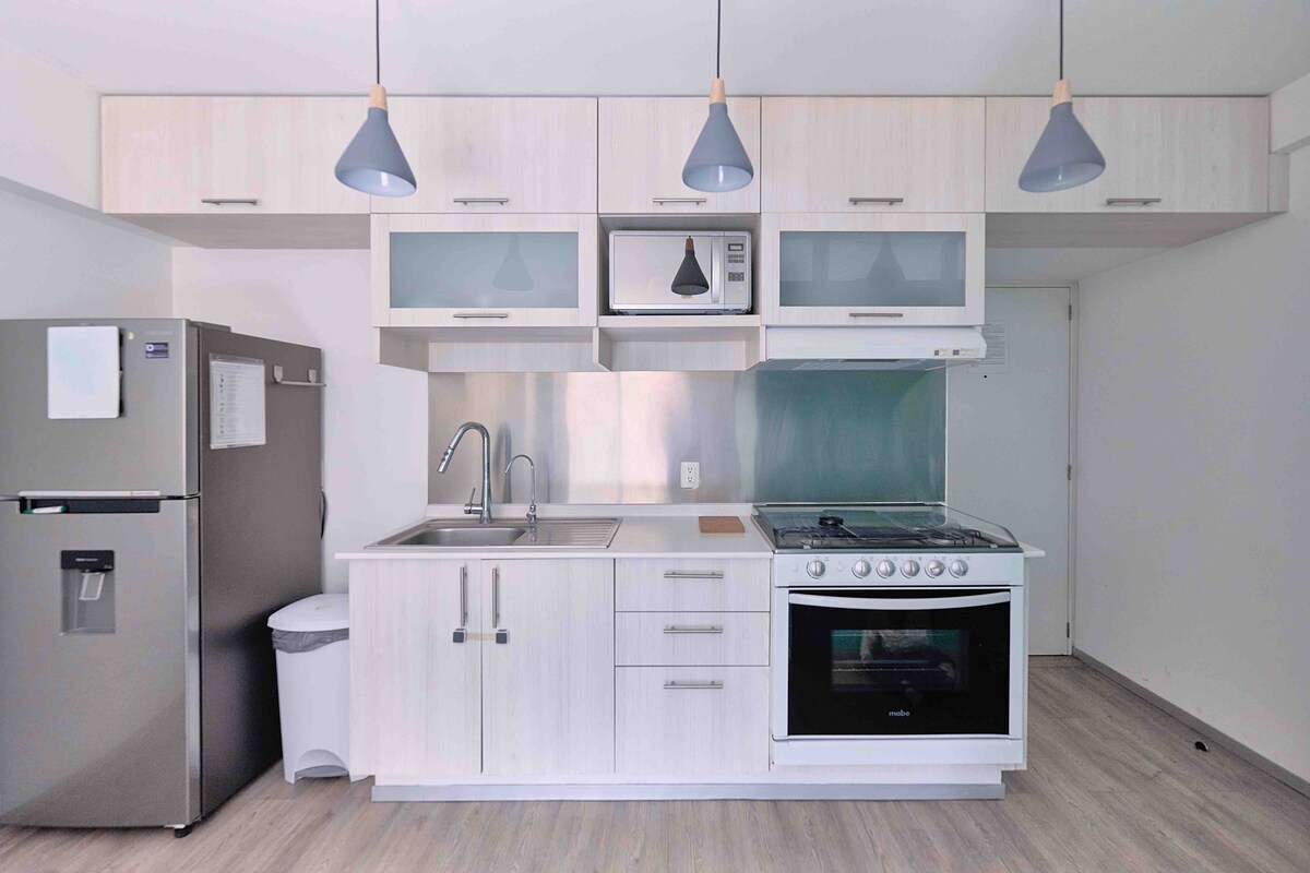 Minimalist apartment in Mexico City. Excellent apartment with jaw dropping view, it has two bedrooms, kitchen, bathroom, laundry room, living room, elevators, parking place and 24/7 security. Excelent location to visit the main attractions of the city, we are at 30 minutes from Polanco, Roma / Condesa, the capital's downtown. In addition, the neighborhood has great places such as parks, museums and restaurants among other things.
