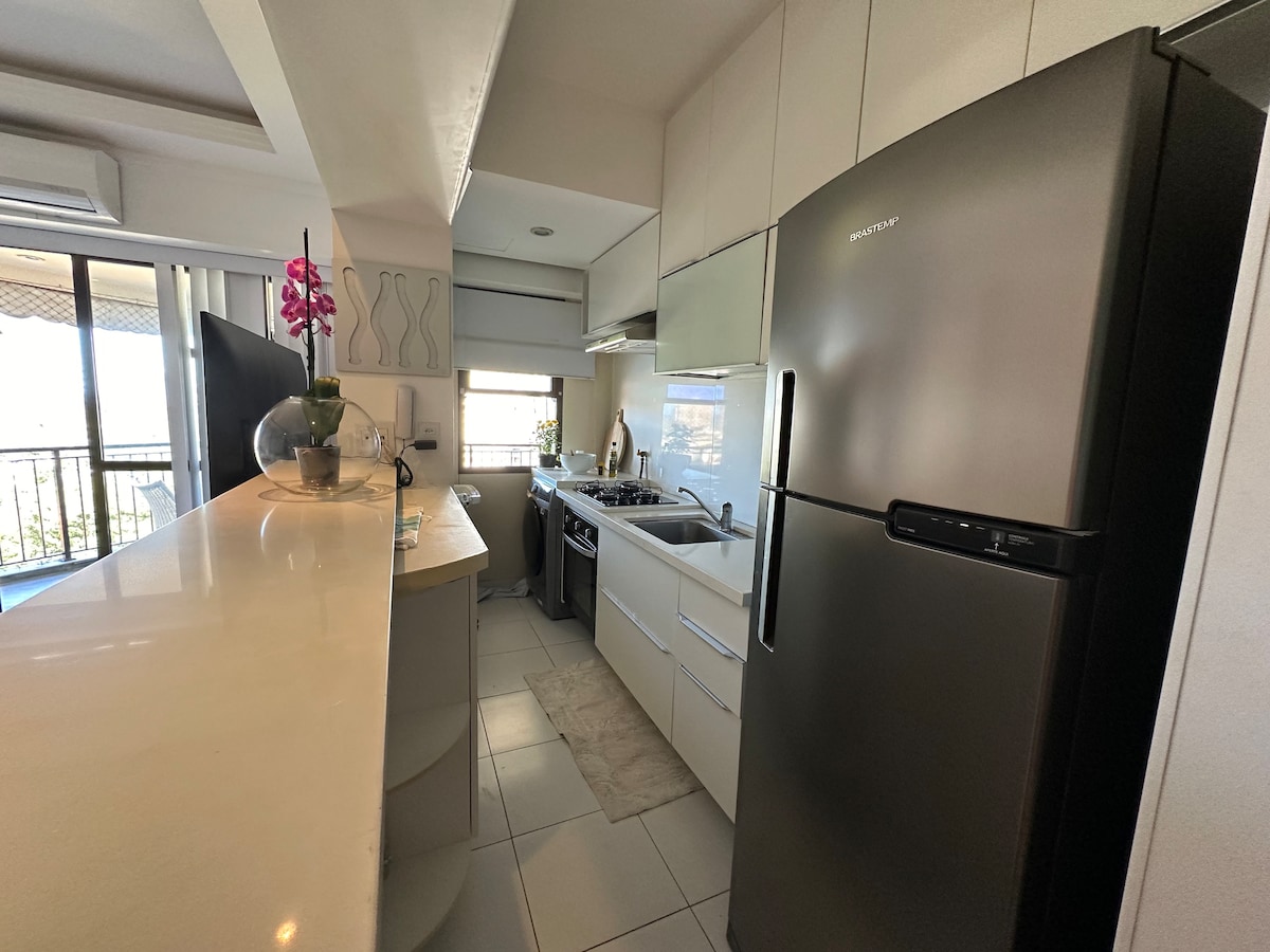 One block from the beach — host speaks Deutsch, English and Español. Lugar tranquilo, muito verde, varanda com vista, rede e sol da manhã. Sala integrada com sofá-cama, TV e split. Quarto com cama queen, closet e cofre. Condomínio com piscina aquecida, sauna, restaurante, mercadinho e estacionamento. 📍 Bem localizado: próx. mercados, shoppings e praia, com acesso de carro, metrô, BRT, Uber e barco-táxi. ⭐ IDEAL PARA: • Casais • Famílias pequenas • Executivos • Trabalho remoto + lazer
