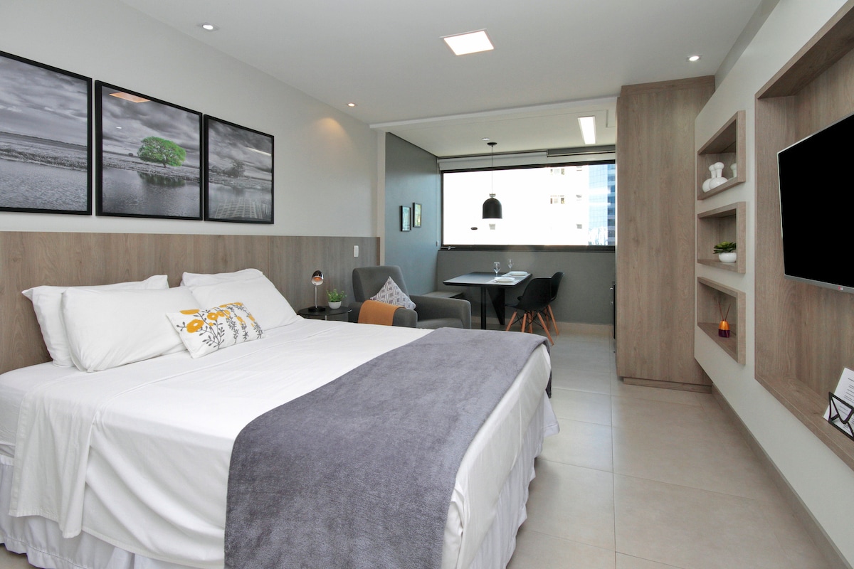 Ժամանակակից և բոլորովին նոր դիզայն ՝ այս բարձրակարգ ստուդիան: Իդեալական վայր է կարճատև այցերի համար հյուրընկալելու համար ։ Իտաիմ Բիբիի լավագույն վայրում գտնվող Studios կոնդոմինիումում, մինչև 1,5 կմ շառավղով ռեստորանների և բարերի ավելի քան 200 տարբերակներով, բացի բազմաթիվ խանութներից, սուպերմարկետներից, դեղատներից, հացաբուլկեղենի խանութներից, առևտրի կենտրոններից և զբոսայգիներից, հնարավոր է ամեն ինչ անել ոտքով: