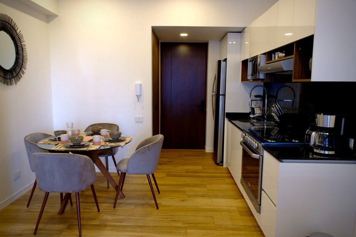 Live like a local in this beautiful one-bedroom studio apartment in a modern, luxury building in the Polanco/Granada area. With complete access to the whole apartment and access to a range of amenity spaces including the Fitness Center, Business Center, playground for kids, parking, roof garden and 24/7 security. No matter if your trip is for business or pleasure, this studio apartment will make you feel at home offering you a complete kitchen, dining and living areas, including a work desk.
