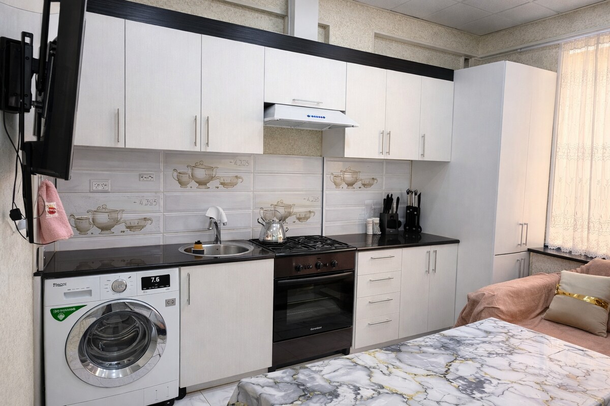 Բացահայտեք մեր հարմարավետ 1 ննջասենյակով բնակարանը Սամարկանդի SmartCity - ում, որտեղ ձեզ սպասում են ժամանակակից հարմարավետություն և ոճային դիզայն ։ Հանգստացեք հարմարավետ ննջասենյակում ՝ հագեցած հարթ էկրանով հեռուստացույցներով և ՛ ննջասենյակում, և ՛ խոհանոցում ձեր ժամանցի համար ։ Մեր լավ կահավորված խոհանոցն ունի բոլոր հիմնական պարագաները, այդ թվում ՝ միկրոալիքային վառարան, սառնարան, լվացքի մեքենա, ջեռոց և բարձրորակ խոհանոցային պարագաներ ։ Մենք կարող ենք նաև օգնել զբոսաշրջիկների գրանցման հարցում։ Մանրամասների համար կապվեք մեզ հետ։