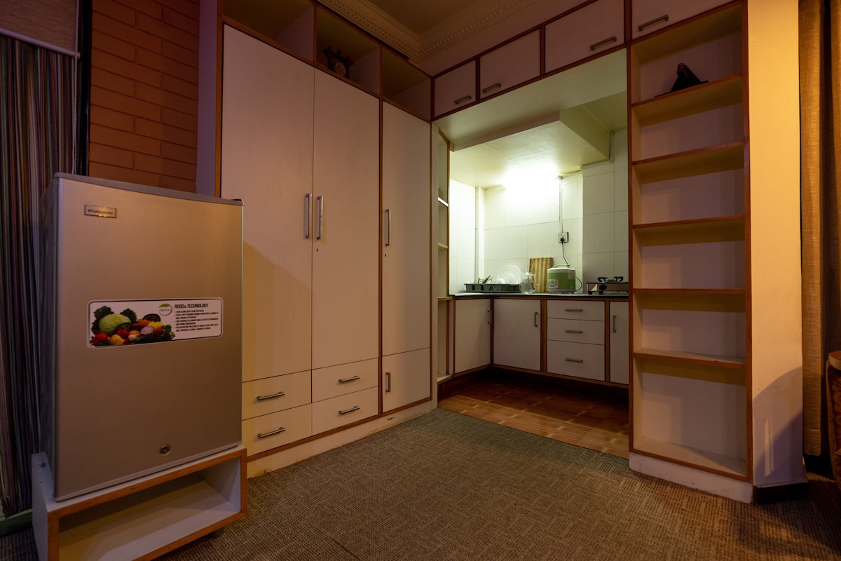 This modern, fully furnished studio is perfect for couples or solo travelers seeking an authentic stay in historic Patan. Located on the main street, it’s a short walk to Patan Durbar Square, Krishna Temple (5 min), Labim Mall (7 min), and Pulchowk UN Office (15 min). Being in a lively central area, it’s best suited for guests who enjoy a vibrant atmosphere rather than complete quiet. We offer 15% weekly and 30% monthly discounts. Ask us about stays longer than 3 months.