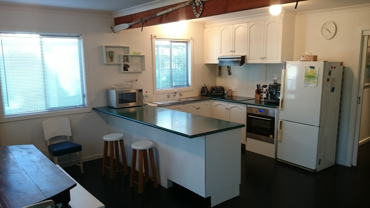 Quaint iconic Island տուն, 2 հարկանի 3 Ննջասենյակ Քոթեջ գեղեցիկ թաղամաս դիտարկումներ դեպի թփուտ, մոտ է լաստանավի. Վայրի բնություն ։ Հետևի տախտակամած ։ Առջևի վերանդա ։ 5 մահճակալ, ներքև ՝ երկտեղանի ննջասենյակ ՝ լոգասենյակից օգտվելու հնարավորությամբ ։ Դեպի վեր. Մահճակալ 2, 1 Queen և Bed 3, 1 King size մեկտեղանոց, 1 մեկտեղանոց մահճակալ, ըստ ցանկության, տրենդային մեկտեղանոց, Porta cot: Կա 2 լոգասենյակ ՝ 1 լոգասենյակ ՝ ցնցուղով, 1 զուգարան, 1 լոգարան ՝ տանը, այնուհետև ՝ լոգասենյակից դուրս ՝ 1 ցնցուղի խորանարդով, 1 զուգարան, 1 ունելի: