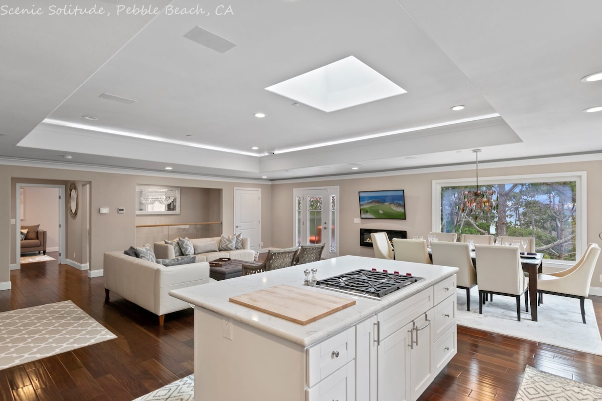 Spacious, light-filled Carmel hilltop home with large hot tub and sweeping views of ocean & forest. 🌲🌅 With 3 balconies + generous primary suite on main floor, this highly private retreat offers an elegant tranquility with coastal charm. Spacious 🍽️ fully stocked kitchen features espresso machine + conical burr grinder 🫘☕ as well as French Press and sizeable gas range. 3 bedrooms +3 pull-outs. Chore-free checkout. Property is *not* walkable to downtown Carmel. Outdoor BBQ is electric.