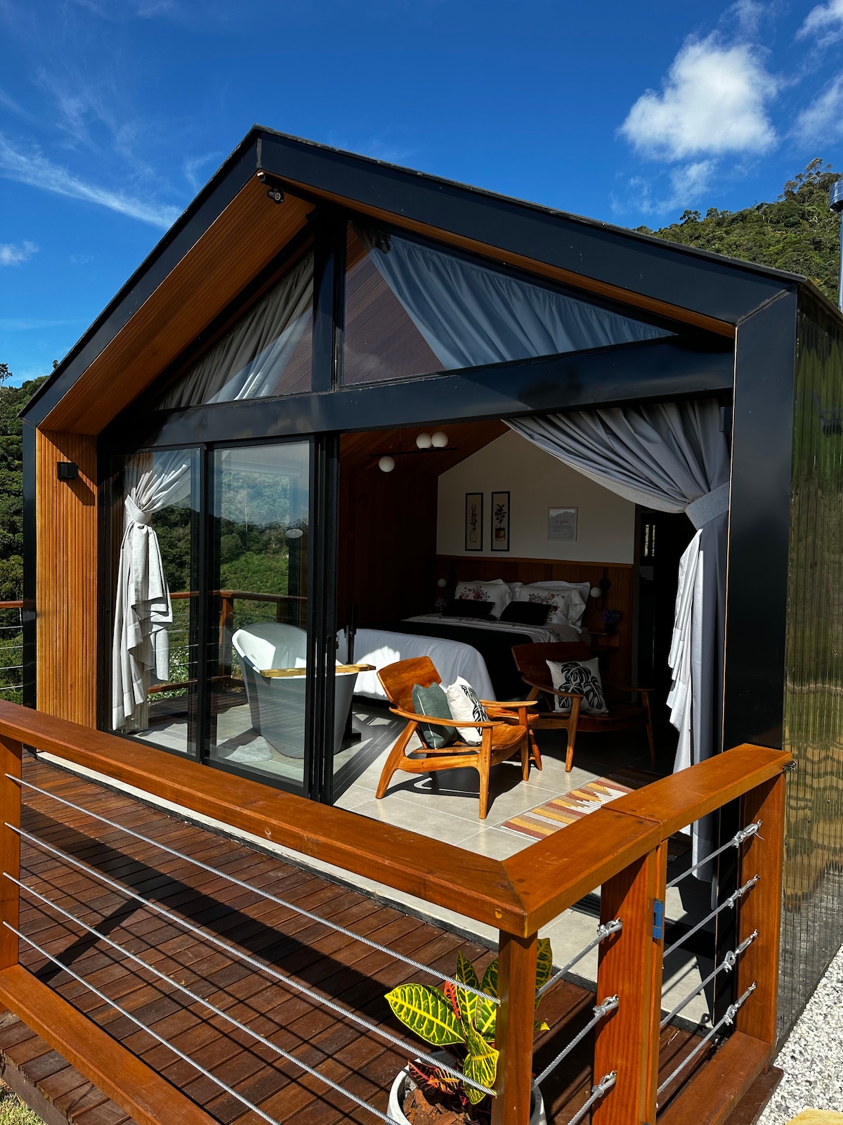 A Casa Vista foi concebida para quem busca amplitude, silêncio e conexão com a paisagem. Com amplas aberturas voltadas para as montanhas, o espaço convida a desacelerar e contemplar o entorno em todos os momentos do dia. A banheira com vista é um dos pontos centrais da experiência, proporcionando um ambiente de relaxamento profundo em meio à natureza. No deck externo, o cenário se transforma ao longo do dia, criando momentos únicos ao amanhecer e ao pôr do sol.