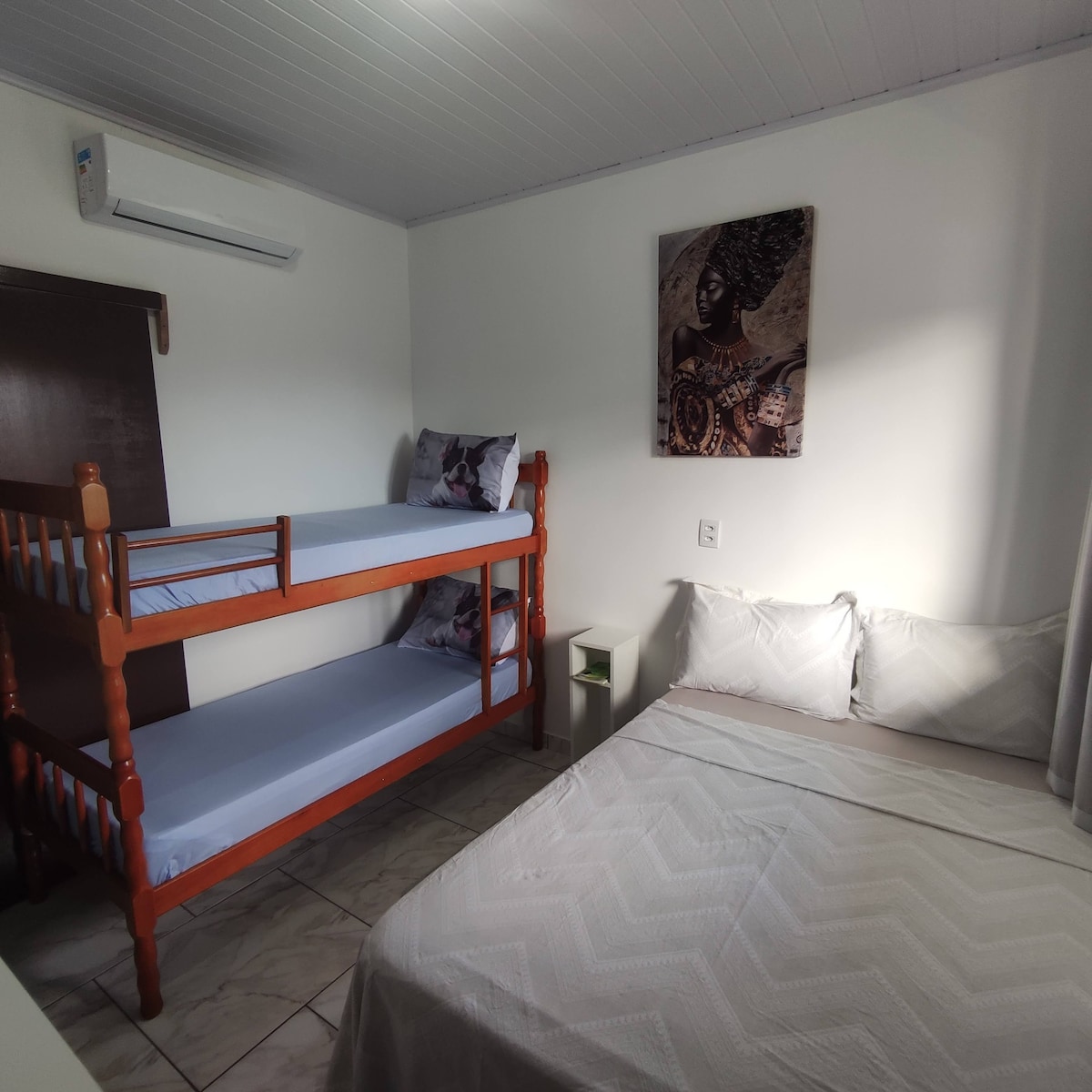 Ambiente familiar, tranquilo e aconchegante. Estamos a 600m da praia e 900m do maior parque temático da América Latina, o Beto Carrero World. Próximo a supermercado, posto de saúde, farmácia, restaurante, hamburgueria, pizzaria, etc. Nossa suíte está equipada com TV, frigobar, ar-condicionado e Wifi. Temos também estacionamento privativo e uma cozinha compartilhada.