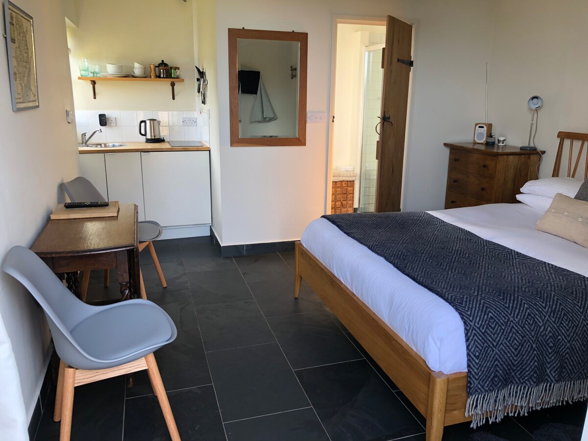 Newly built beautiful self-contained unit situated on the first floor of a detached building within the boundary of a family home. Large living/sleeping area including a luxurious king size bed; seating area and tea & coffee making facilities. Recently installed kitchen area with fridge: oven & microwave. Large smart TV.Additional day bed makes the suite perfect for families. Separate bathroom with electric shower. Private outside seating area overlooking the beautiful Monmouthshire countryside