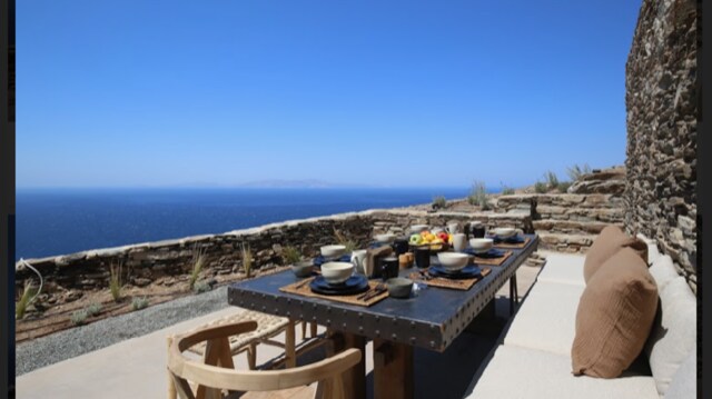 Step into a uniquely revisioned traditional Cycladic home perched at the edge of Ktikados village. Drop your bags, sweep open the double doors leading to the patio and settle in to an amphitheatrical view of mountain and sea! The property consists of a series of terraces ideal for al fresco dining, lounging, and unparalleled sunset views. During the day you can expect fly-bys by the local crows unique to the island and after the sun sets, moonlit visits from the valley sheep.